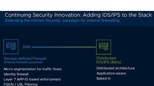 NSX Distributed IDS/IPS has an expectation engine build-in to the hypervisor for single-pass analysis and elastic throughput scale with workloads. The solution is expected to be in beta in VMware’s fourth fiscal quarter 2020, ending Jan. 31, 2020.