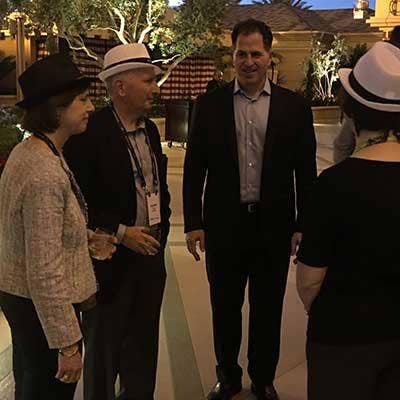 In this case, Dell (center) was at the press and influencer party Monday night, along with Howard Elias (wearing the fedora to Dell's right), Dell EMC's president of services and IT.